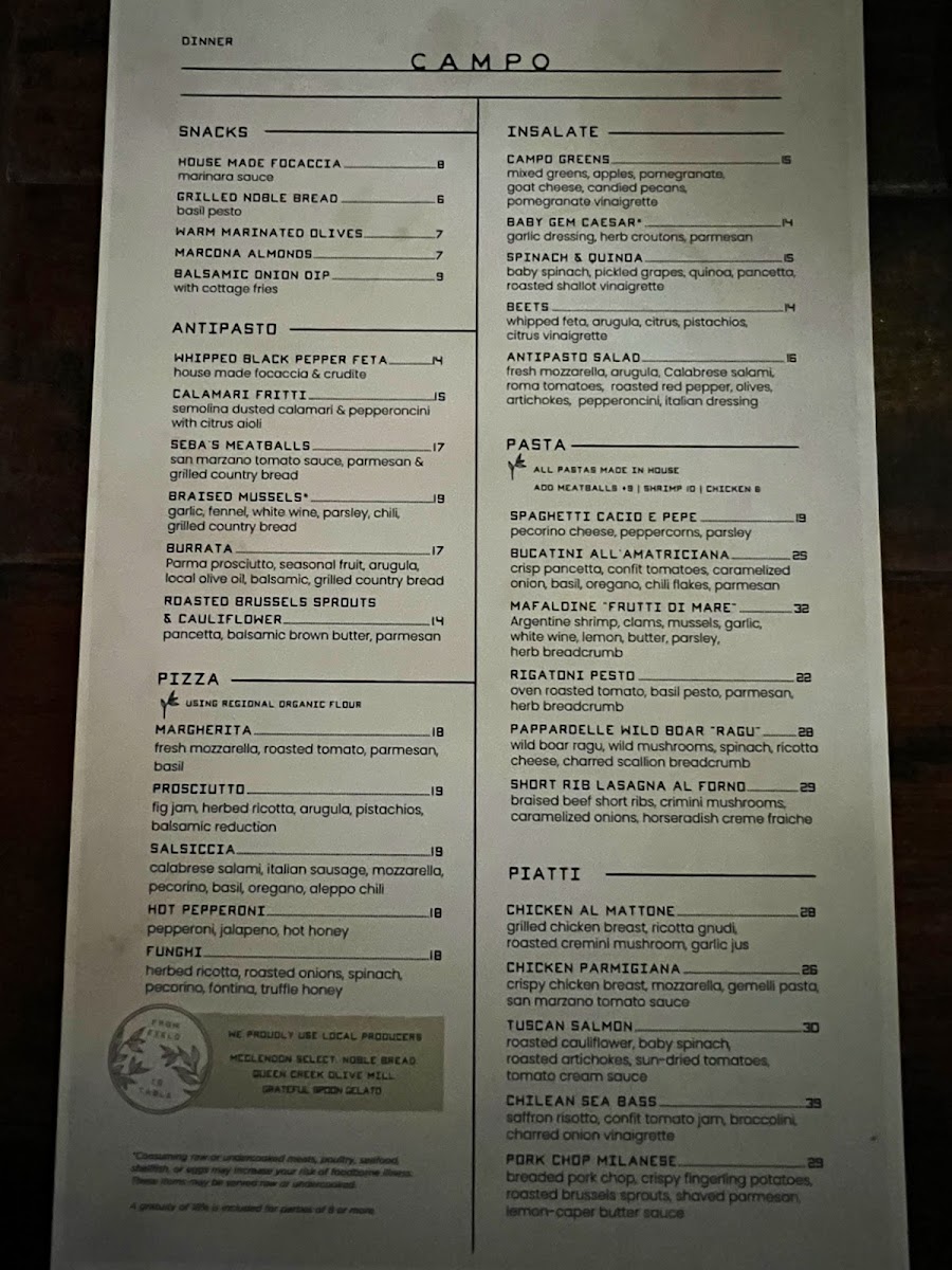 Welcome to Campo Italian Bistro & Bar, a splendid culinary gem nestled in the heart of Scottsdale, Arizona. A place where rustic Italian cuisine meets modern elegance, Campo is not just a restaurant; it’s an experience that enchants the senses. Located at 8260 Hayden Rd Suite A102, Campo invites you to step into a vibrant atmosphere that pays homage to authentic Italian dining.