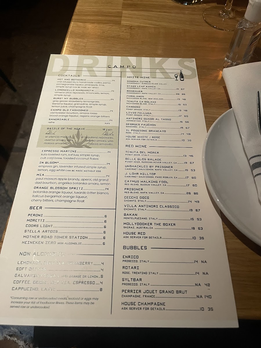 Don’t overlook the kids' section, which features comforting classics like Kids Pizza and Chicken Fingers that are sure to please young diners. The ambiance is welcoming, and the staff provides attentive service, enhancing your dining experience. As guests rave about the vibrant atmosphere and delicious cocktails, it's clear that Campo is a must-visit destination for food lovers seeking flavorful Italian cuisine.